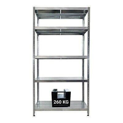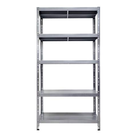 Scaffale in kit modello "Maciste", ad incastro. 5 ripiani in acciaio anti ruggine con rinforzo, da cm.100x40. Portata 260Kg per ripiano. Compreso di 4 piedini in plastica. Si consiglia il fissaggio a parete per maggiore stabilità