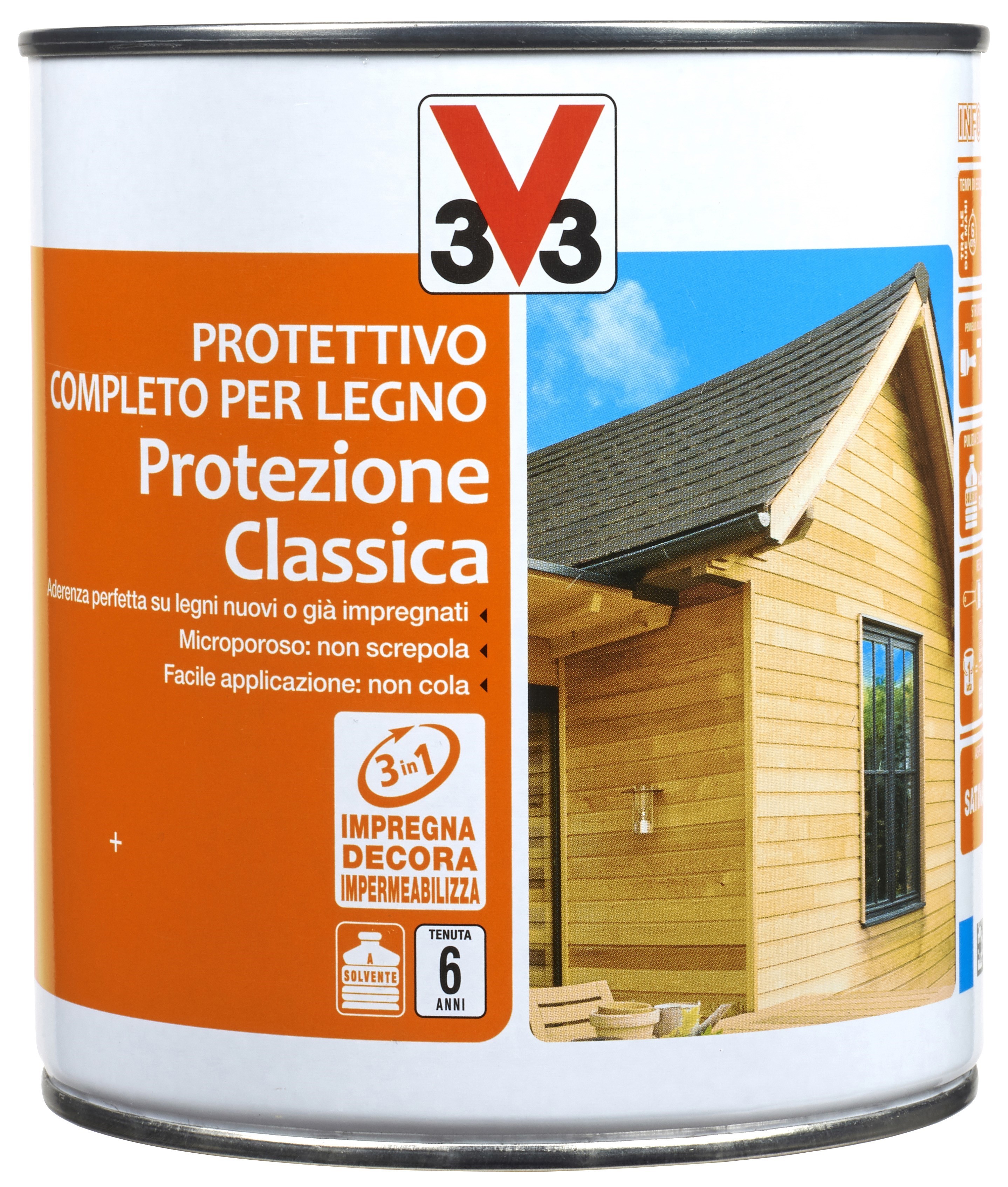 Il protettivo completo V33 protezione classica, a base di resine alchidiche, è ideale per proteggere e decorare i rivestimenti in legno esterni e interni. La sua speciale formulazione garantisce massima resistenza e una protezione di lunga durata dalle aggressioni climatiche e dai raggi ultravioletti. V33 Protezione Classica è il protettivo completo per legno raccomandato per il legno esterno come persiane, cancelli, recinzioni, serramenti, finestre, travi, gazebo. Si può applicare su qualsiasi tipo di legno, nuovo e già precedente verniciato. La sua eccezionale capacità di copertura gli conferisce un aspetto satinato intenso. Non cola: formulazione cremosa per un’applicazione facile anche in verticale. Lascia respirare il legno grazie alla sua formulazione microporosa. 3 IN 1: Impregna, decora e impermeabilizza.